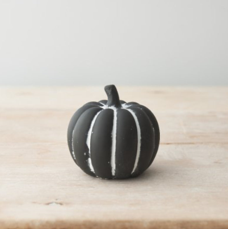 A stunning cement pumpkin decoration with a hand painted finish. A bold black and white design which is on trend this season.