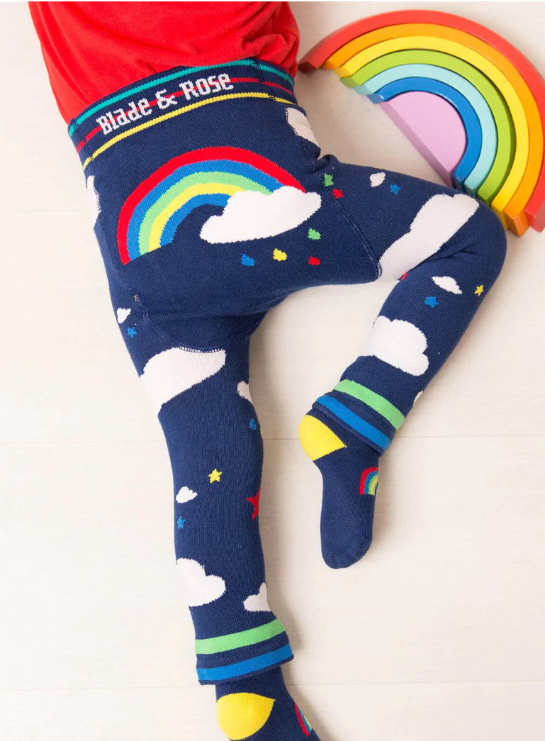 Our weather leggings are navy based with fluffy clouds and colourful stars pattern on the legs and a lovely rainbow on the bum with stripy waistband and ankle cuffs.