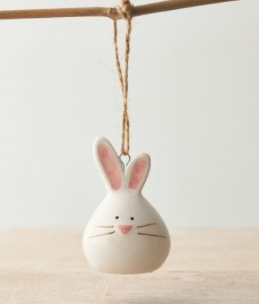 A charming bunny shaped decoration with pink pastel details and a rustic jute string hanger.