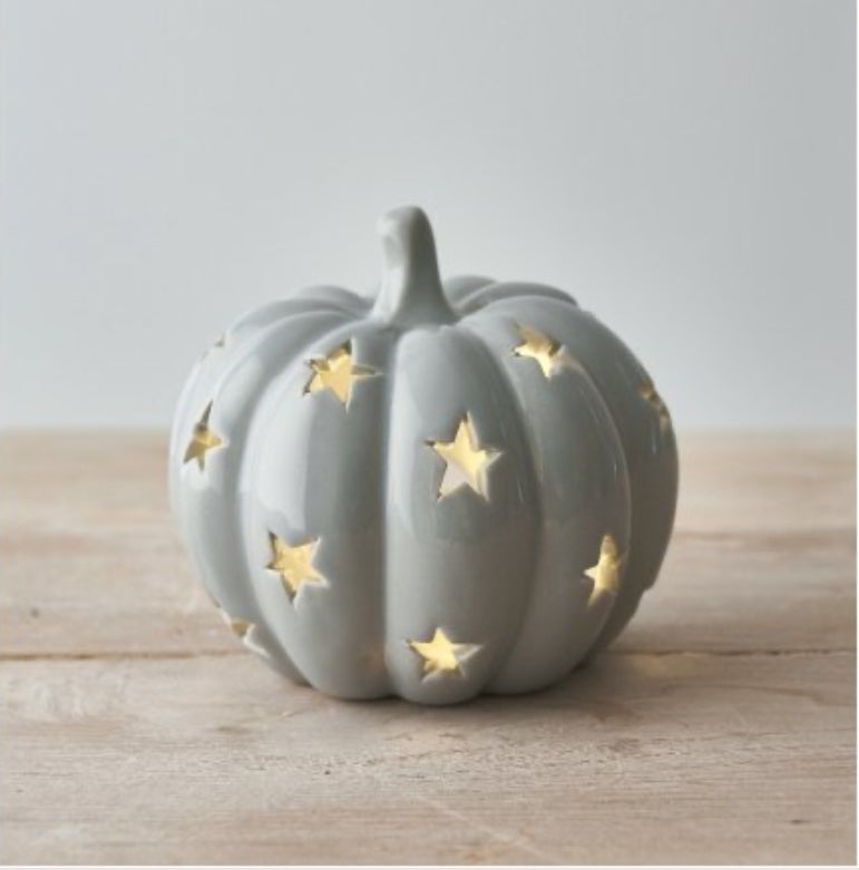 A charming tea light holder in a grey pumpkin design, complete with a glossy finish and star cut out details. Perfect for letting the warm glow to fill your space.