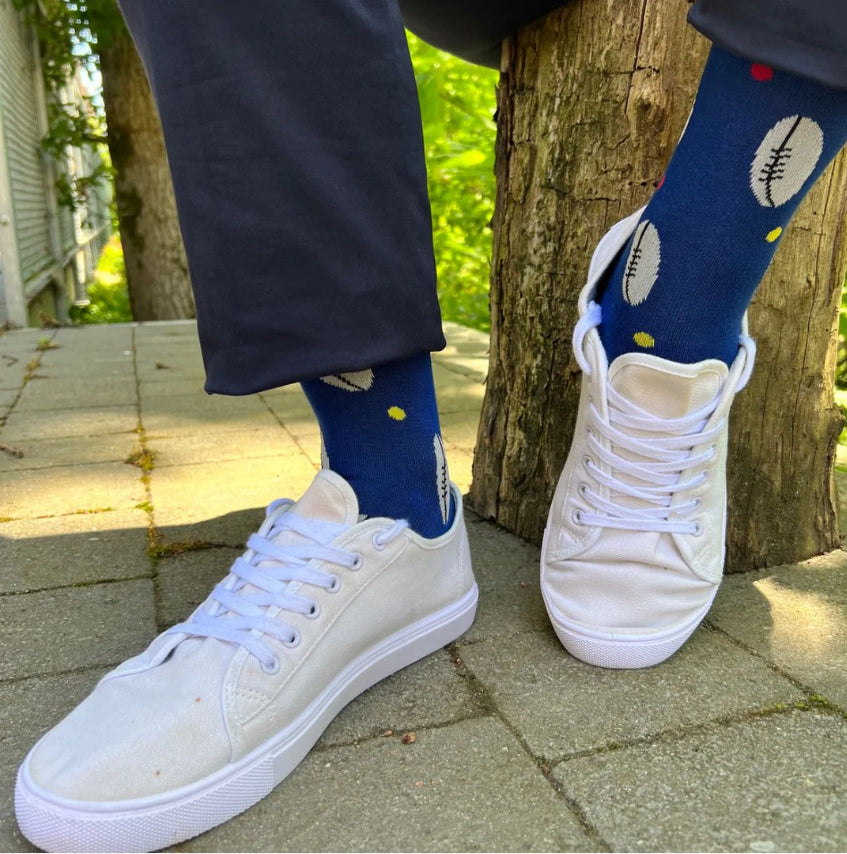 The design of these bamboo socks features a classic rugby ball pattern, set against a bold blue background. The rugby ball graphics are sleek and stylish, making them stand out and catch the eye.