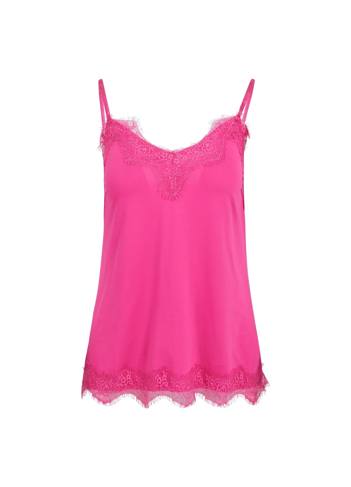 A sleek and elegant camisole with a soft V-neck and adjustable spaghetti straps. The top features lace details and has a relaxed fit. Can be worn under a sweater or a jacket, but also just as a top.