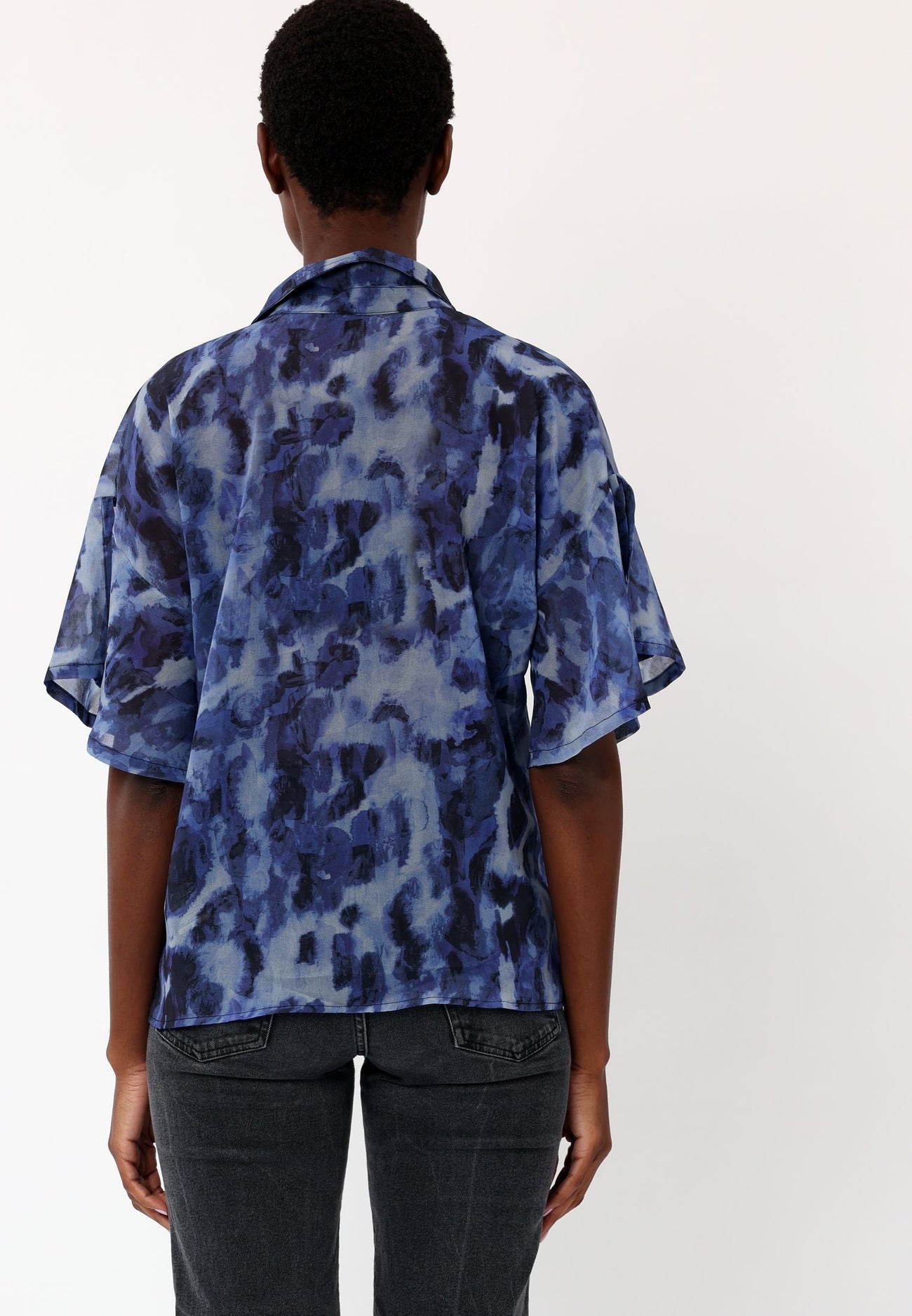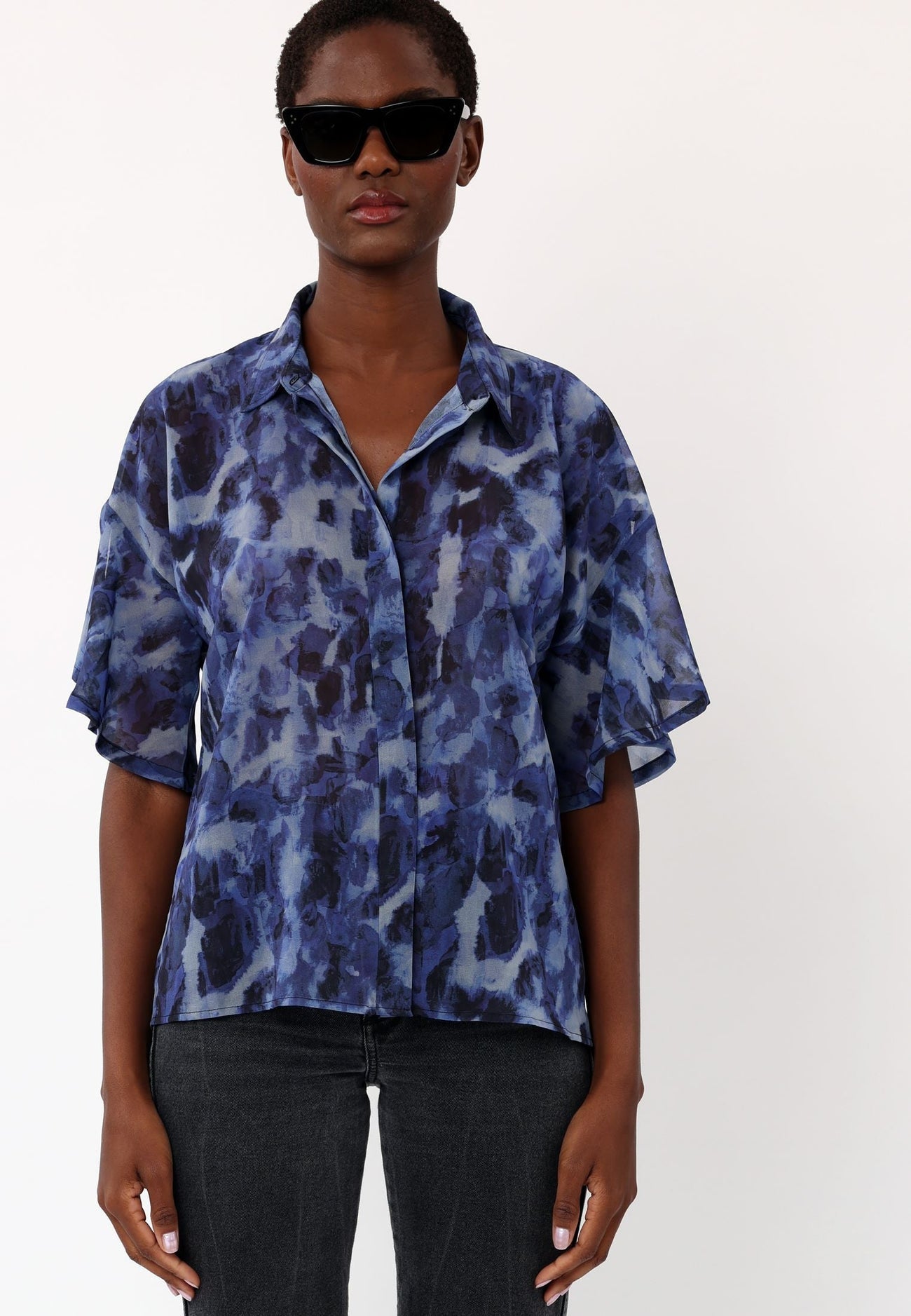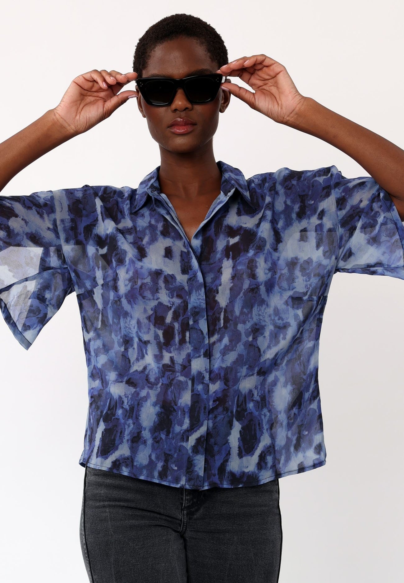 The Sublime shirt in our hand-painted abstract print in blue tones is perfect for a day-to-night edit. This sheer style features a classic collar, regular fit, button through placket and fluttery sleeves with a top slit. An easy shirt that will go great with jeans as with tailored trousers. The model wears a size S. This style is made with 50% recycled fabric made of plastic bottles.