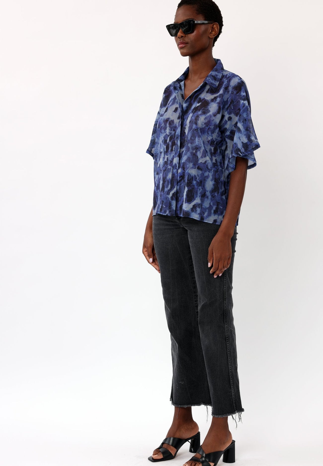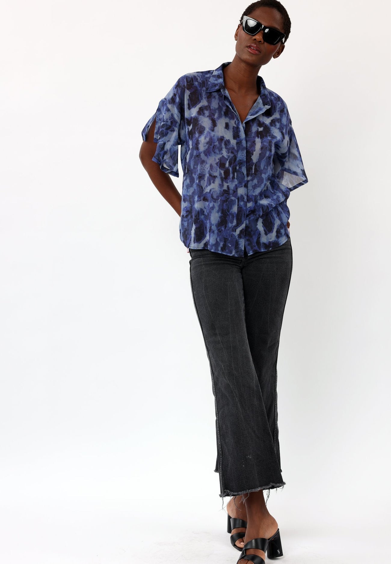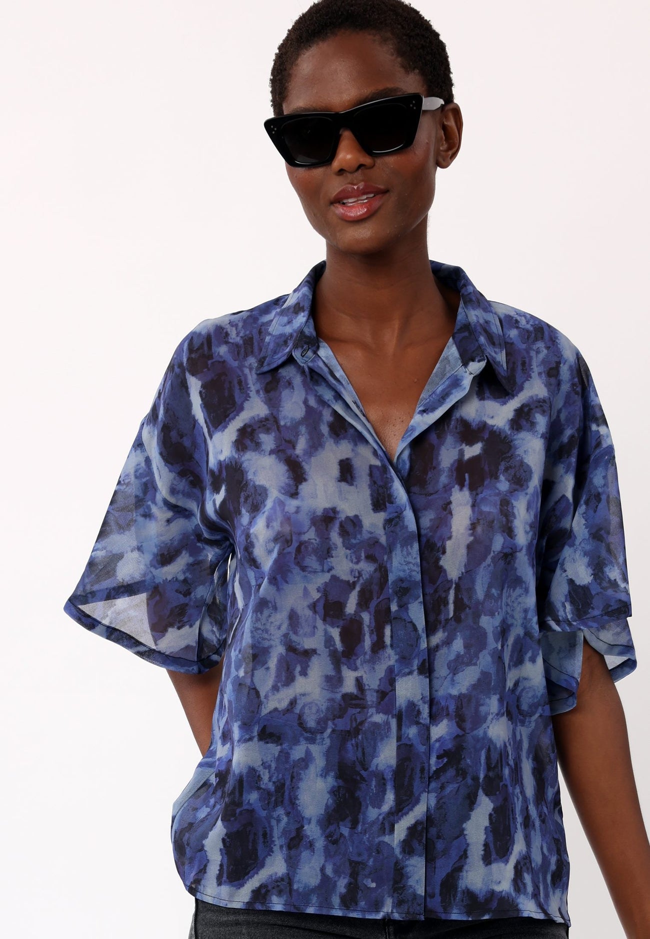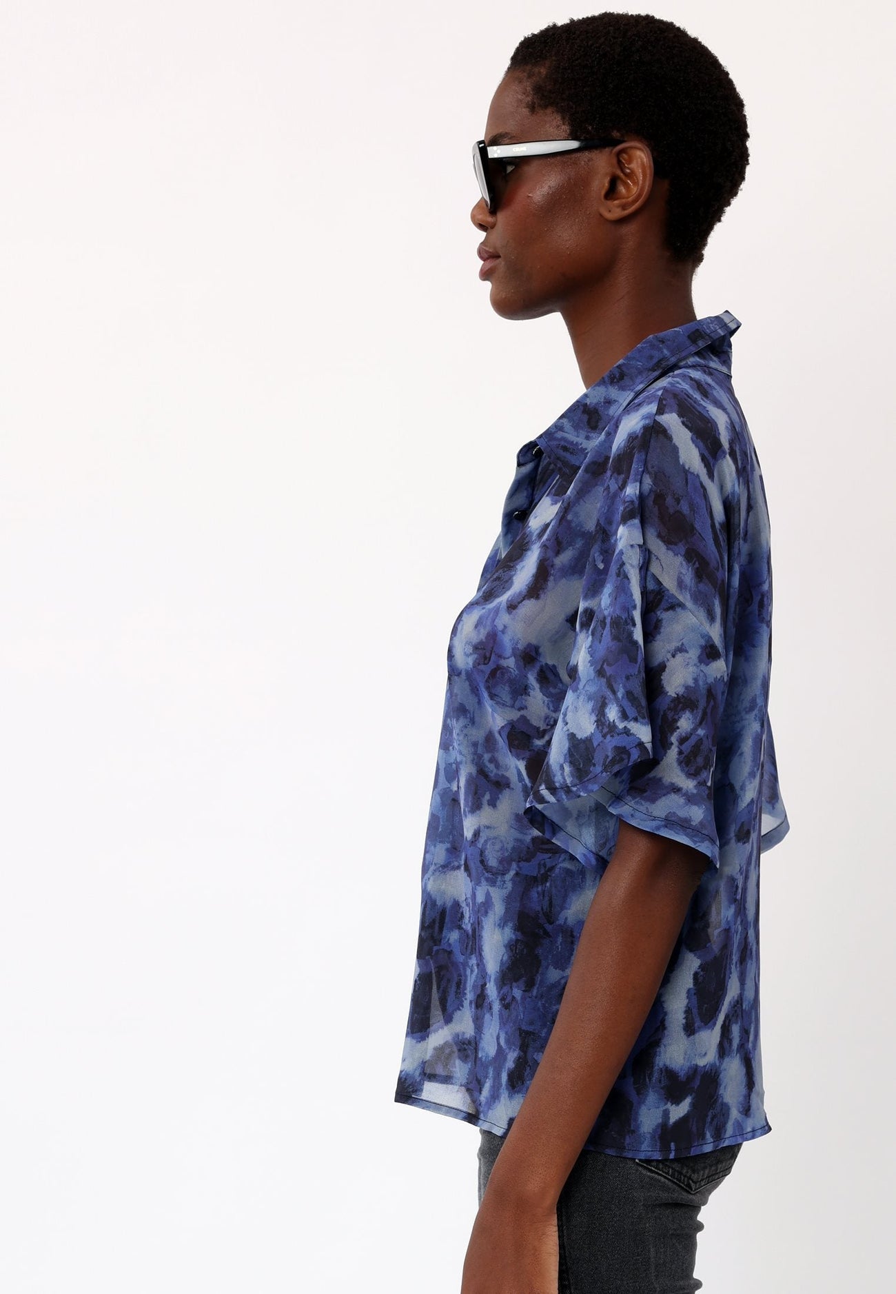 The Sublime shirt in our hand-painted abstract print in blue tones is perfect for a day-to-night edit. This sheer style features a classic collar, regular fit, button through placket and fluttery sleeves with a top slit. An easy shirt that will go great with jeans as with tailored trousers. The model wears a size S. This style is made with 50% recycled fabric made of plastic bottles.
