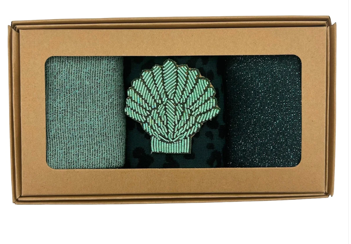 Three pairs of socks in a box - with an embroidered shell brooch. Wear the brooch on your clothes or coat - two gifts in one!