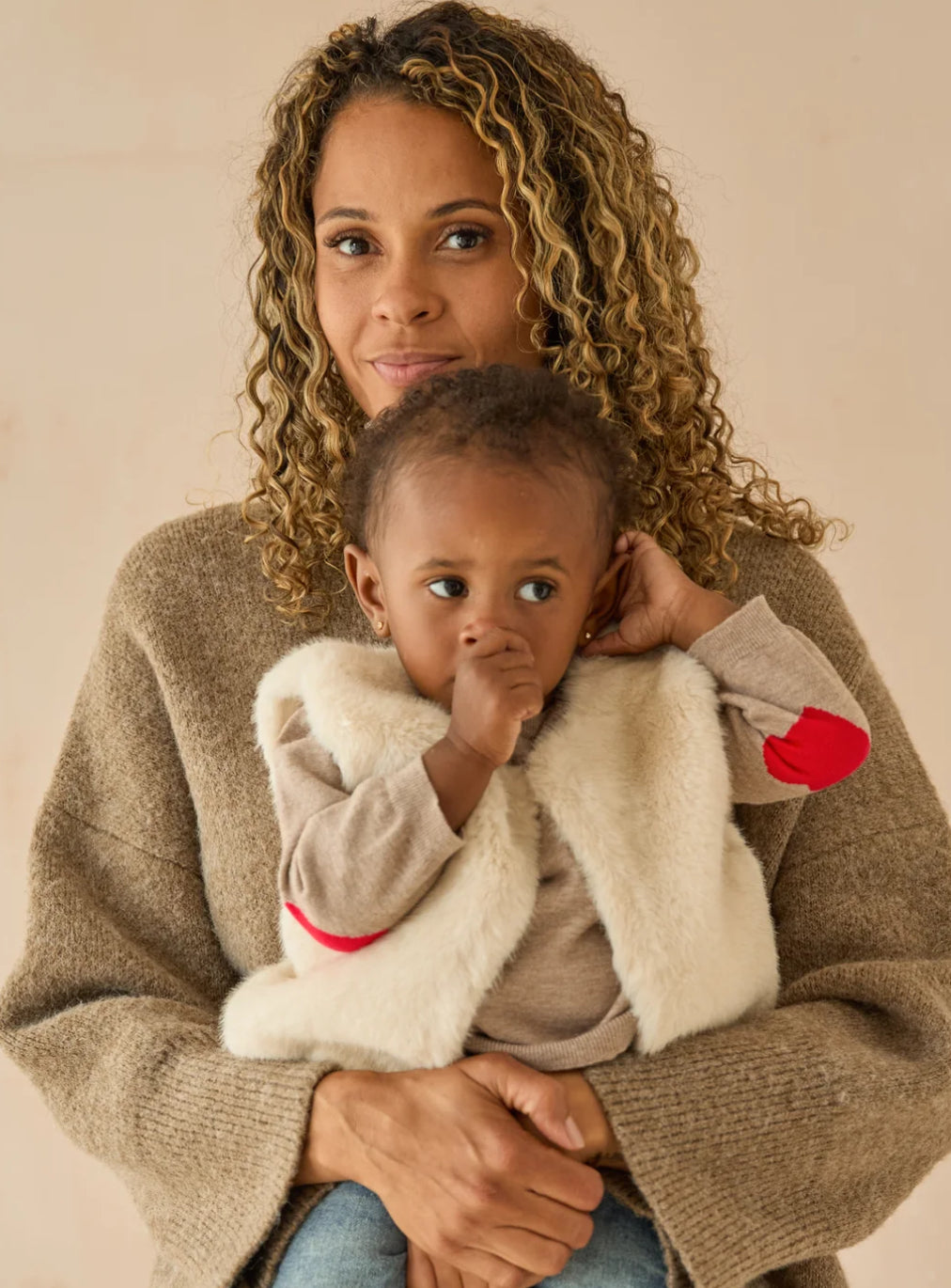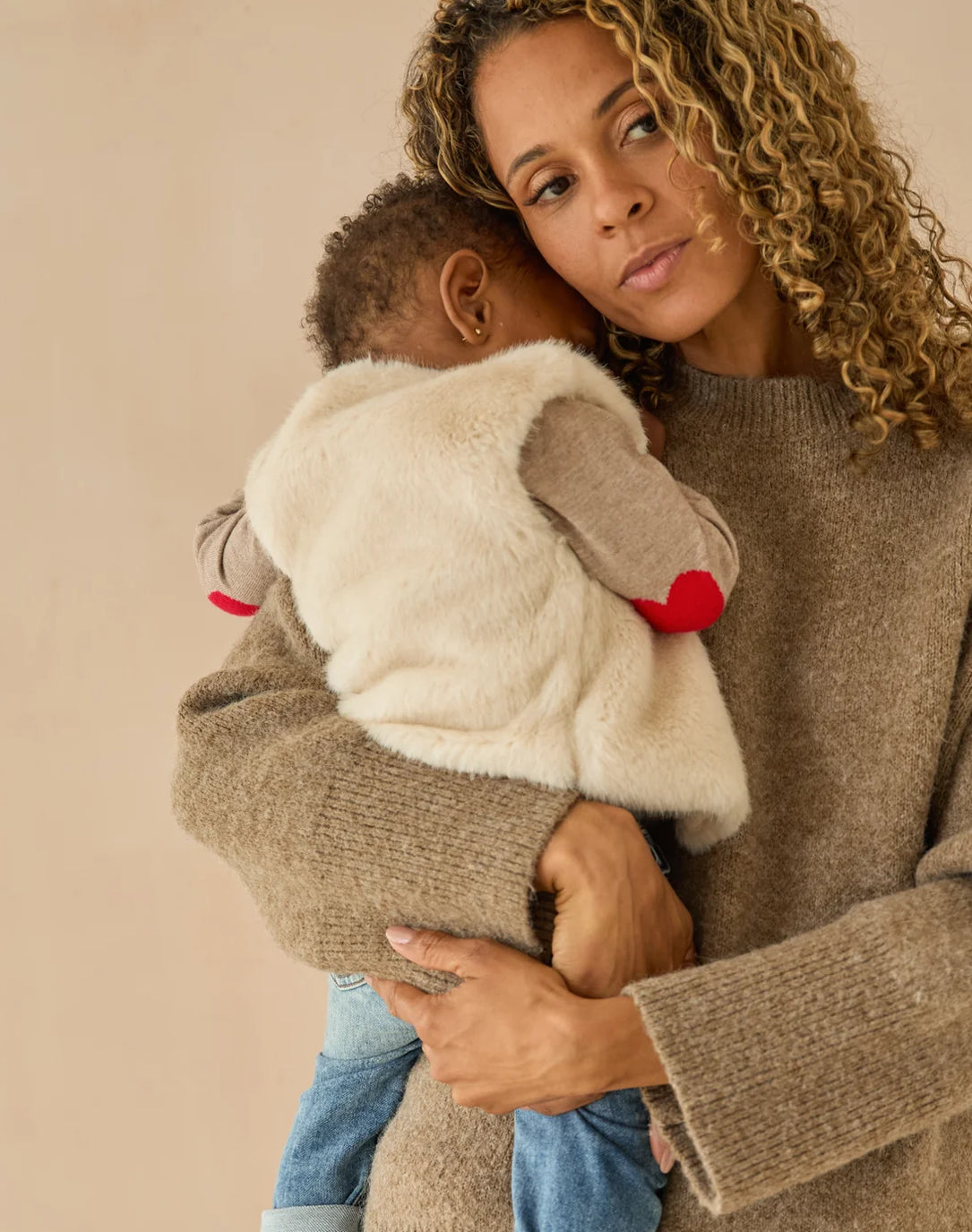 Doe is a soft, furry gilet for little ones — cosy, cute, and perfect for layering. Designed with a round neck and simple hook-and-eye fastening, it’s shorter in length for easy movement and a relaxed look. Pair with the matching grown-up style for a sweet mini-me moment.