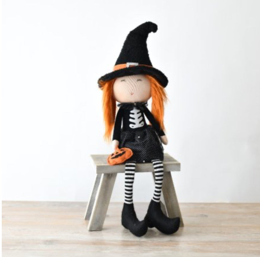 This delightful witch is made from high-quality black and orange fabric, complete with a pumpkin and long legs for an extra whimsical touch.