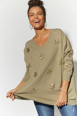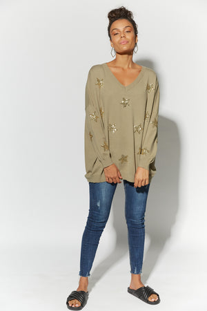 The Galaxy Earth Knit has been created from a viscose and polyamide blend. Oversize in design, this one-size style features a V-neckline, a drop shoulder, long sleeves and ribbing along the neckline, cuffs and hemline. Sparkling sequinned star patterning covers the front and back of this design. Teamed with legging or jeans, this cosy travel essential will keep you feeling comfortable and relaxed however you choose to travel.