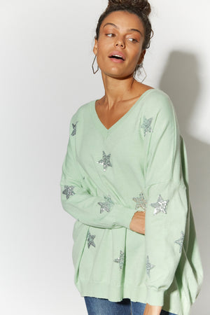 The Galaxy Pastel Knit will add colour to your winter wardrobe. Soft to the touch, sparkling sequinned stars adorn the beautiful pastel backdrop of this design. Falling hip-length with a V-neckline, a drop shoulder and long sleeves, tuck this cosy knit into jeans with ankle boots for an effortlessly chic finish.