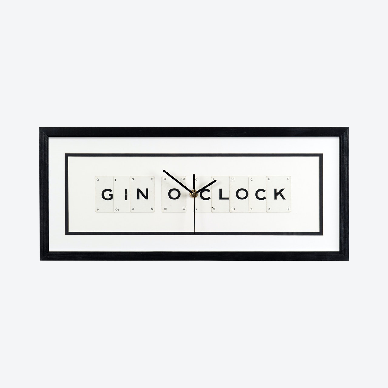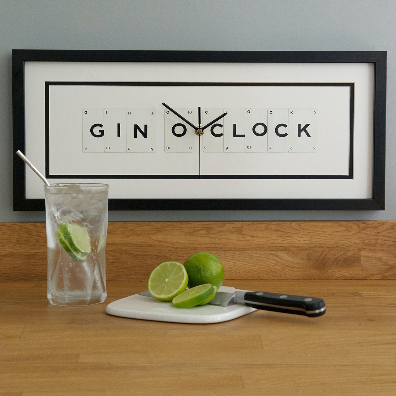 Is this phrase familiar to you?! A unique frame containing individual vintage cards sourced from a 1930s spelling game. The cards are then double mounted with cream and black, into a stylish black wood box frame. A quartz clock mechanism has been inserted into the frame creating an original stylish clock. Black hands complement the vintage letters and box frame.