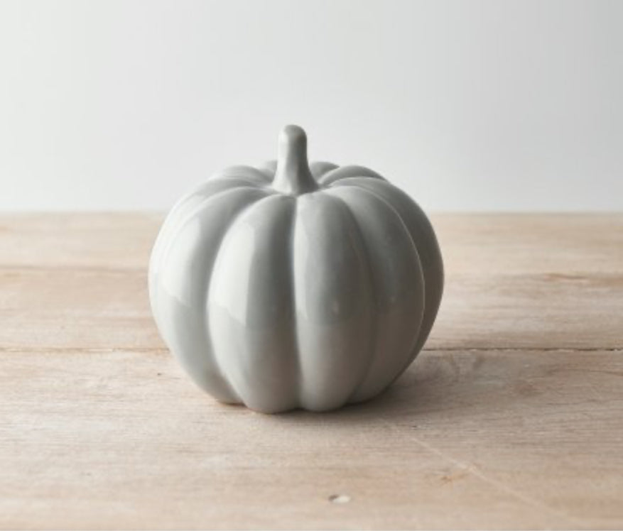 A ceramic pumpkin, in a cool grey colouring, complete with a sleek finish. Sure to add an autumnal touch to any home space.