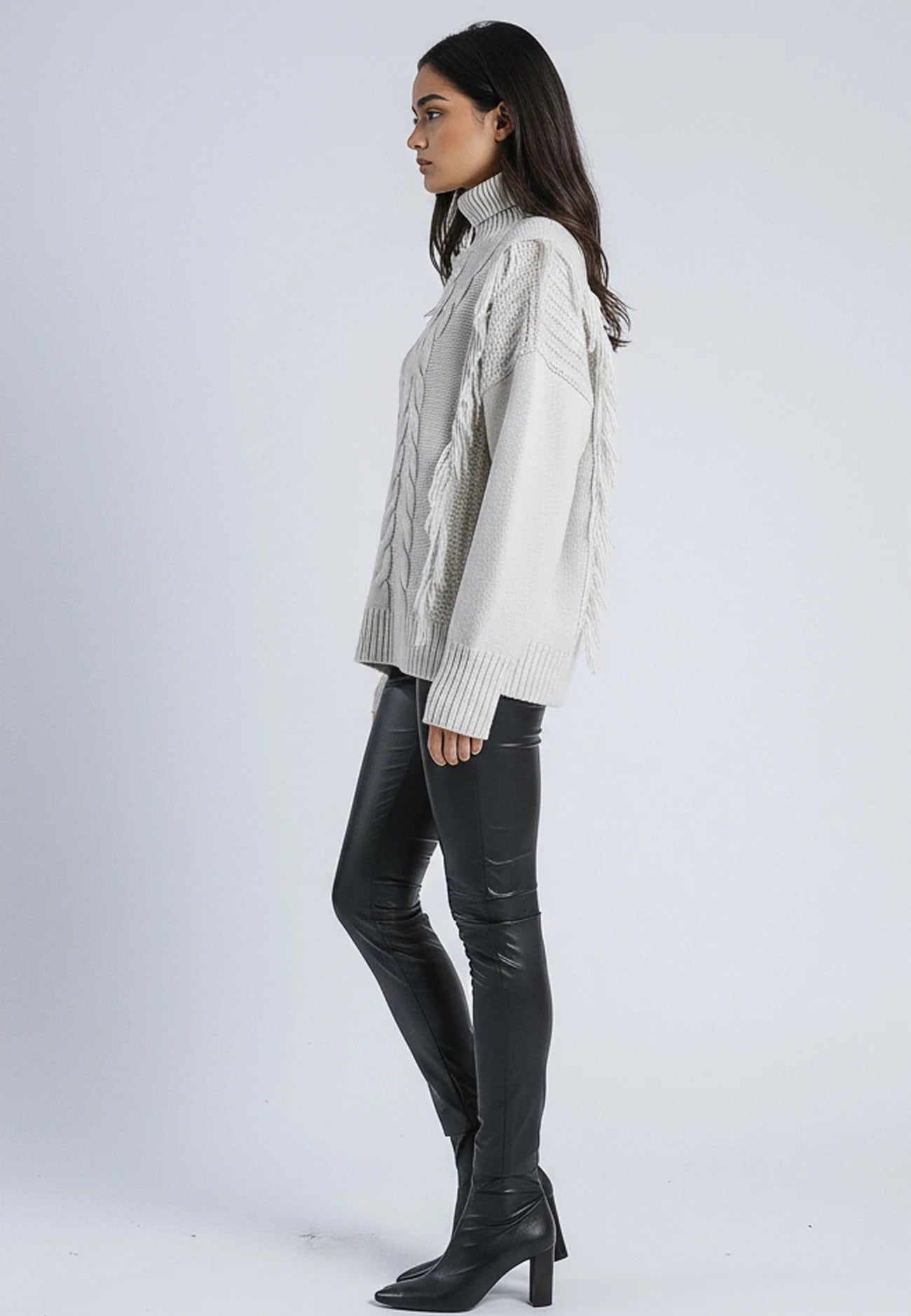 The Jamie Jumper is a stylish and cozy addition to your wardrobe, perfect for cooler weather. This oversized jumper features a classic cable knit design with intricate cables on both the front and back, complemented by unique fringing details for added texture and flair. The turtle neck offers extra warmth and a snug fit, while the long sleeves and hip-length cut ensure comfortable coverage. Embrace the blend of timeless elegance and contemporary style with the Jamie Jumper, ideal for creating effortlessly chic outfits. The model wears a size 10. Length from the top: 63 cm.