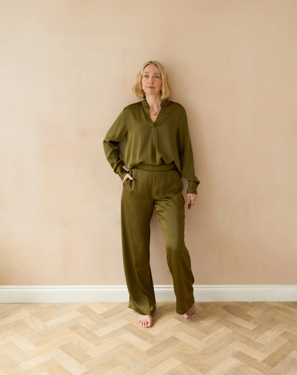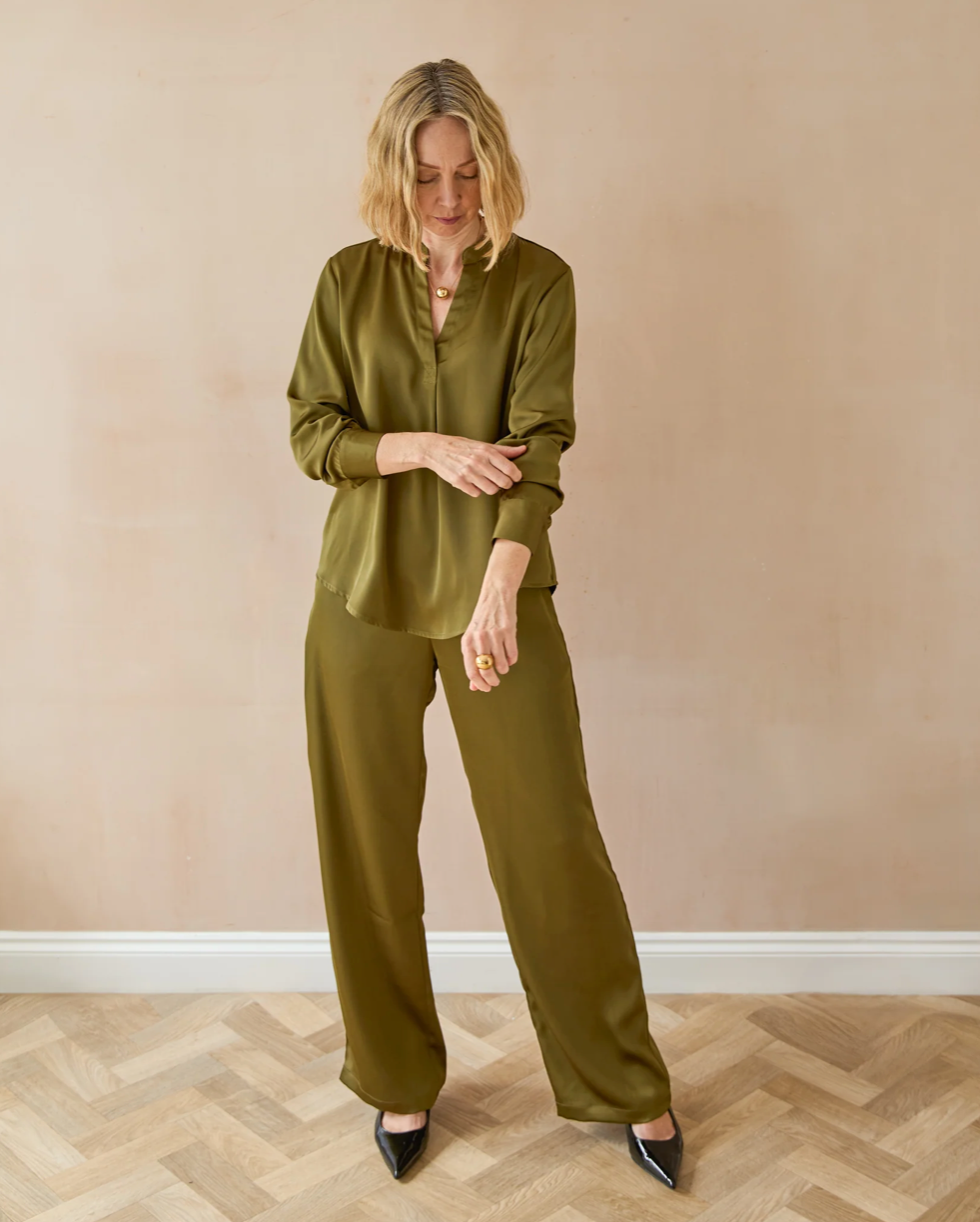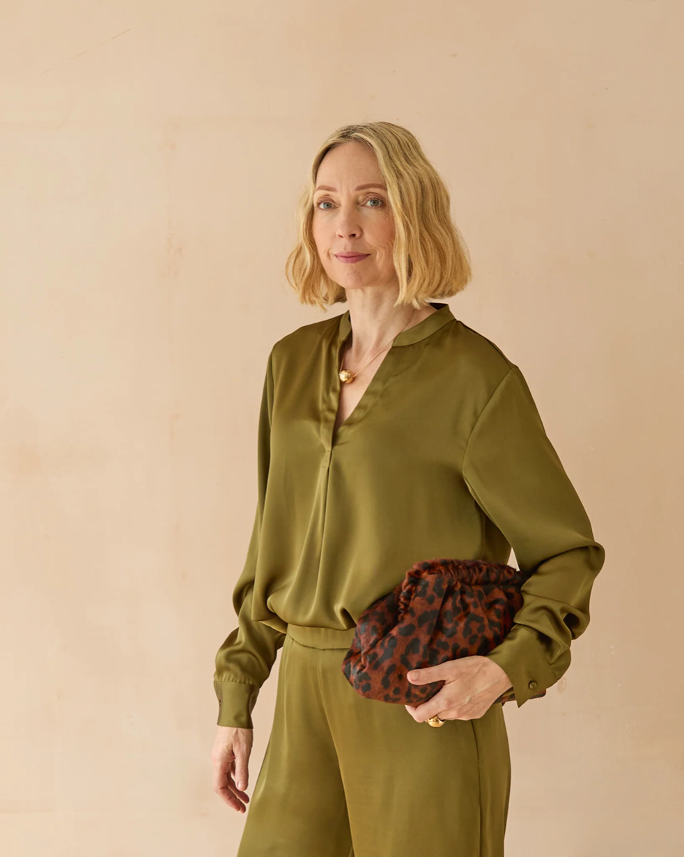 Josie is a sleek satin shirt with a subtle V-neck and long sleeves. It's neat, tailored shape adds effortless elegance - perfect for layering or wearing on its own for a polished look.