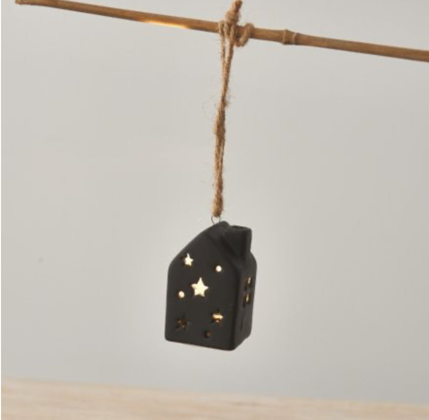 A unique ceramic house in black with cut out stars and a warm glow LED light. Complete with a rustic jute string hanger.