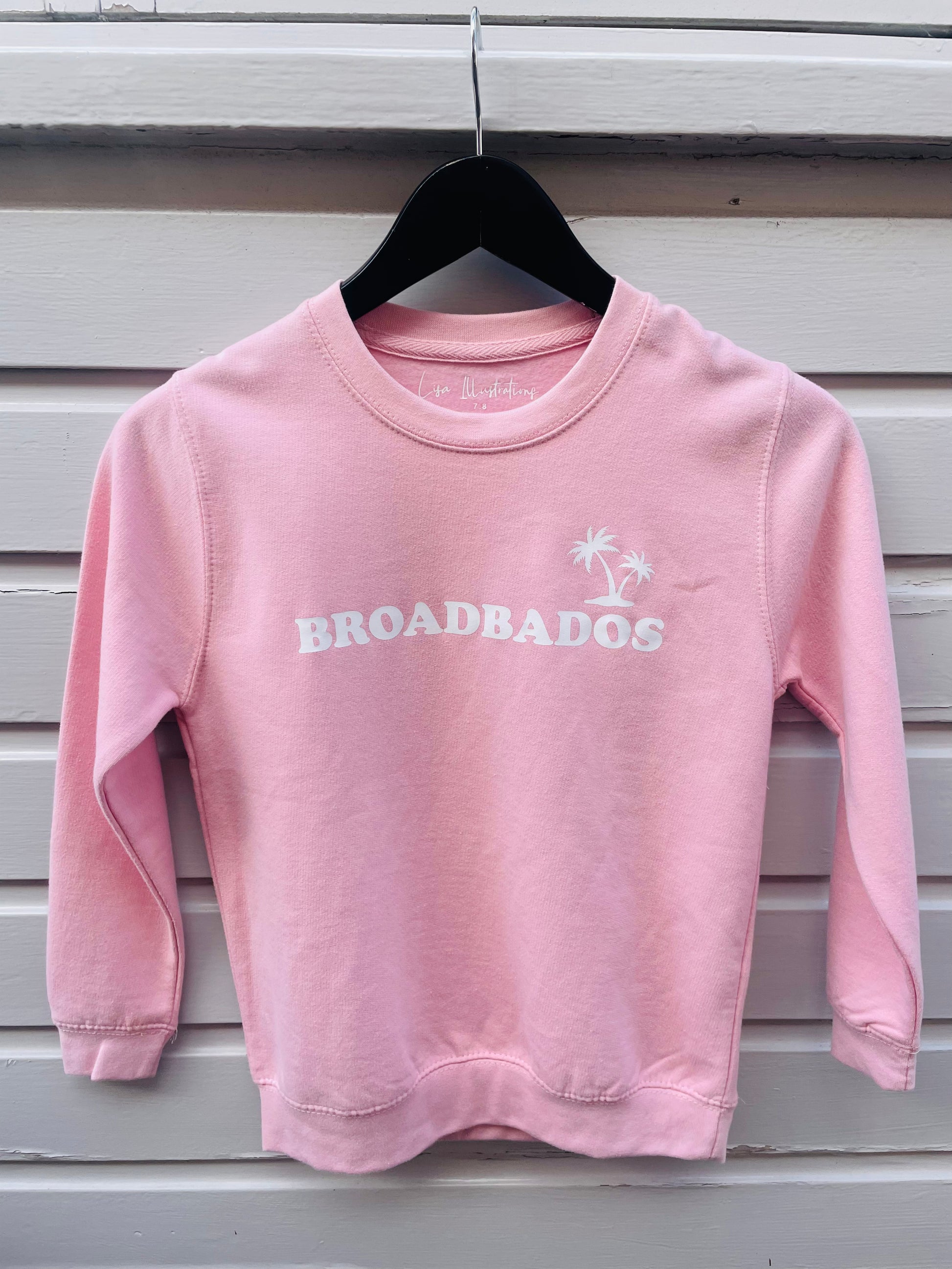 Pink sweatshirt with ‘Broadbados’ written across the chest in white