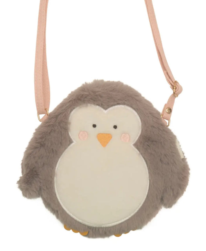 This cosy little penguin bag is perfect for stashing all manner of wintery treats! Made from the softest grey and ivory faux fur, with an embroidered beak and sweet little Rosie cheeks. Fully lined in pink love heart print fabric, this furry bag features a magnetic dot closure and a gold strap with a break point for safety.