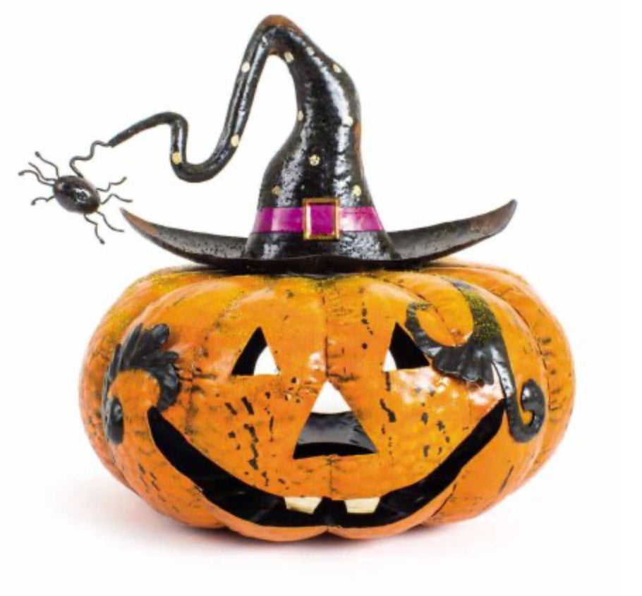 A colourful and characterful metal pumpkin candle holder. Beautifully detailed with a spider and witches hat.