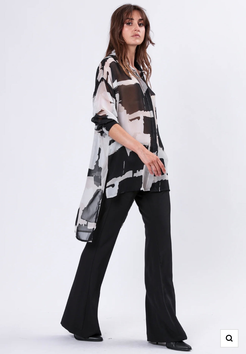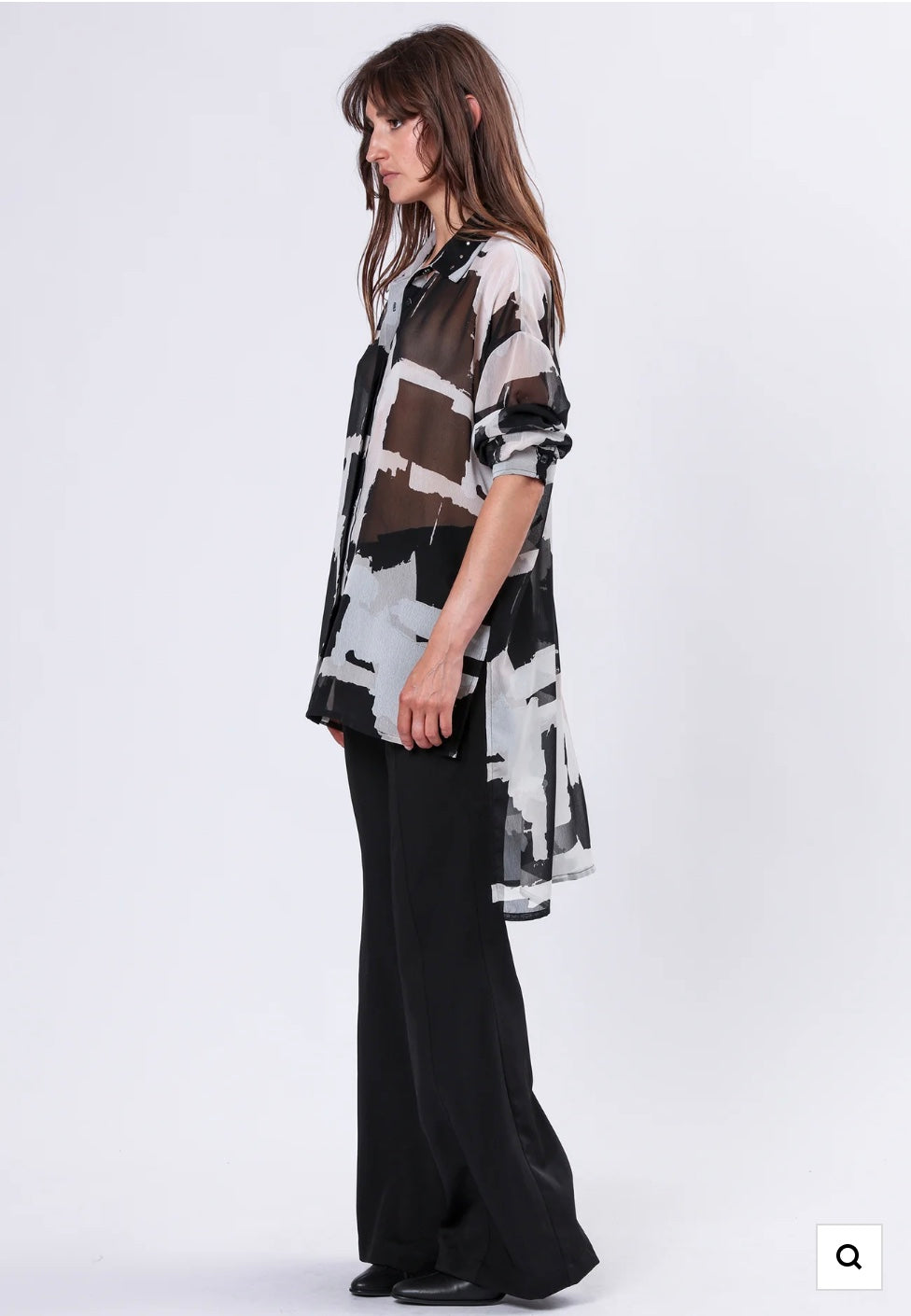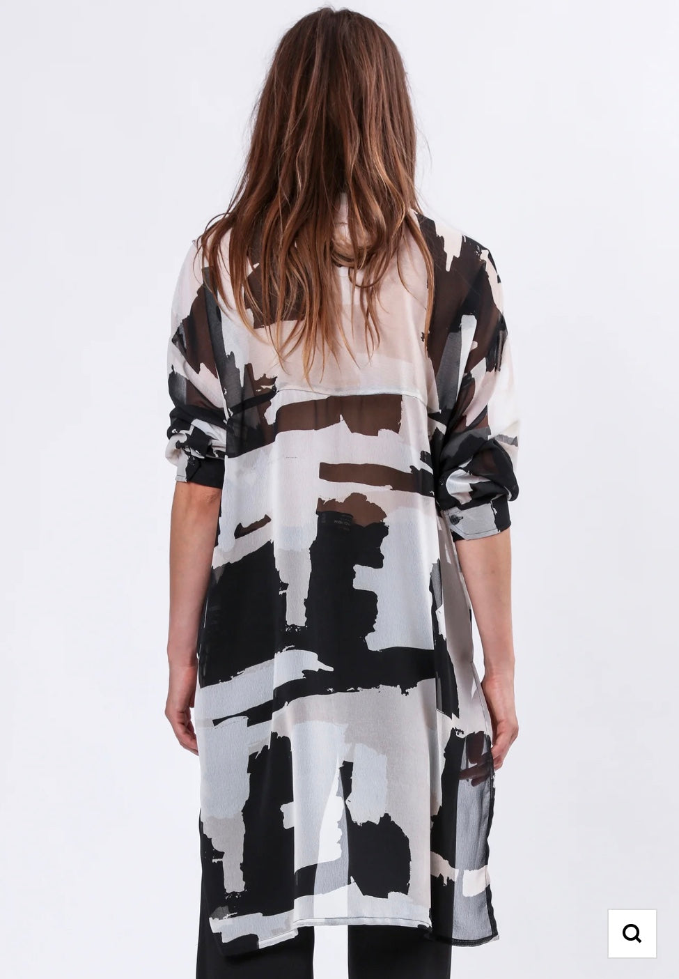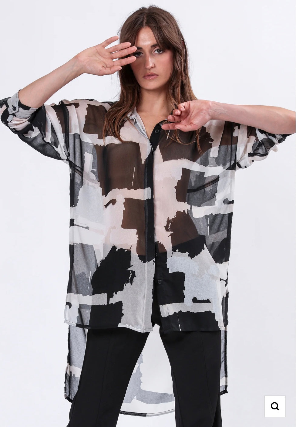 The Miracle Shirt is an oversized, long-length shirt with a classic collar adorned with metal studs. It features a button-through front, long sleeves, and a stylish high-low hem, with the back longer than the front. The shirt is made in our abstract Cloak print in neutral tones. Wear with the matching Aurora skirt in the same print for a full look. The model wears a size S. Please go down 1 size if you like it better less oversized. Length: 72 cm