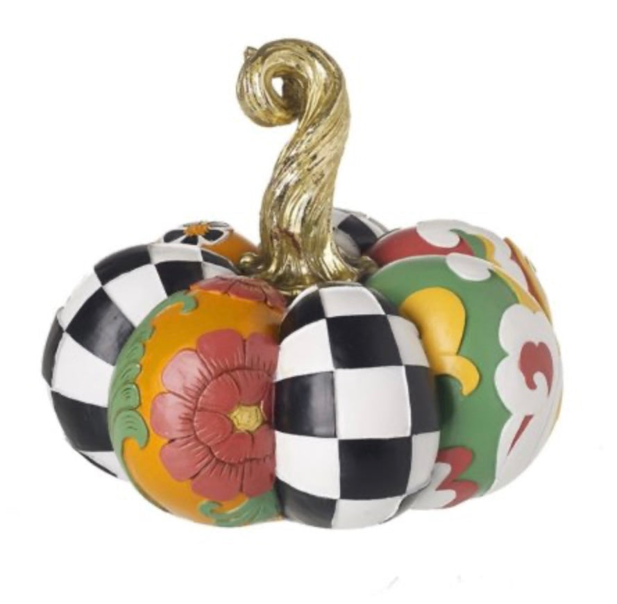 A bright and bold patchwork pumpkin ornament with a checkerboard and floral contrasting design.