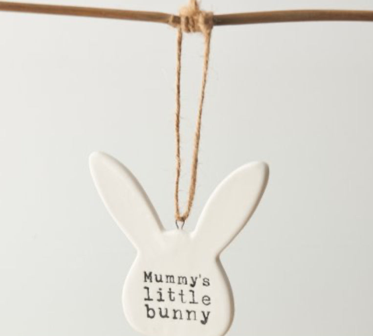 A charming and unique bunny shaped porcelain decoration with a cute stamped slogan reading 'Mummy's little bunny'.