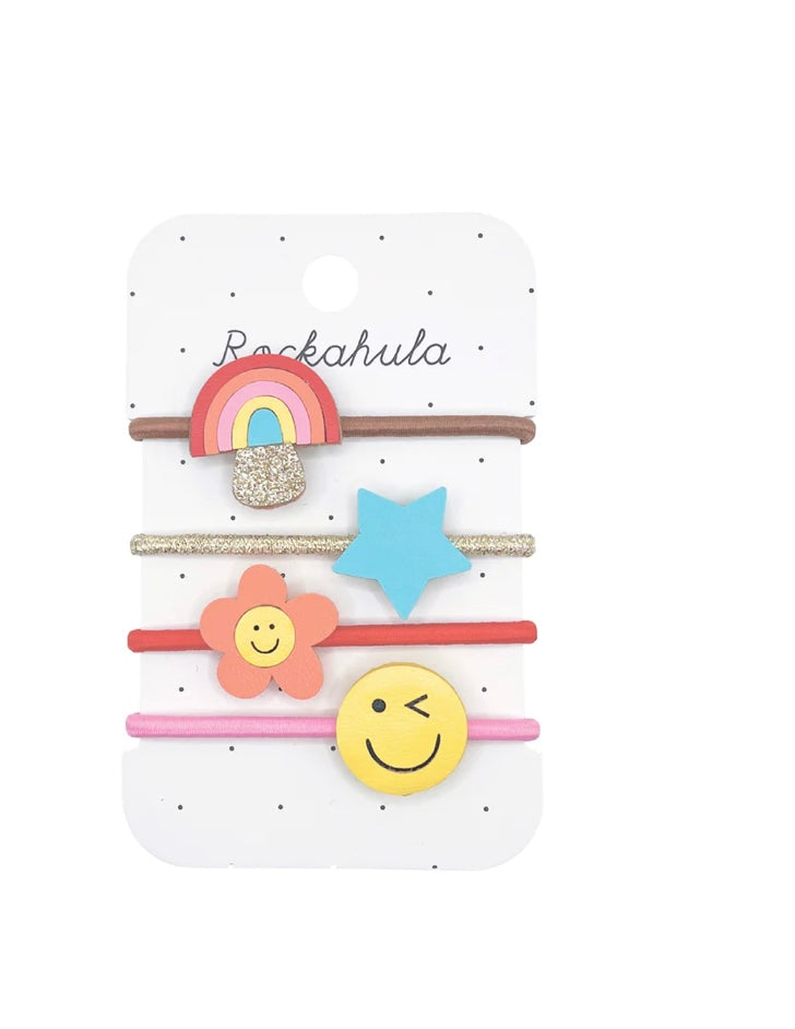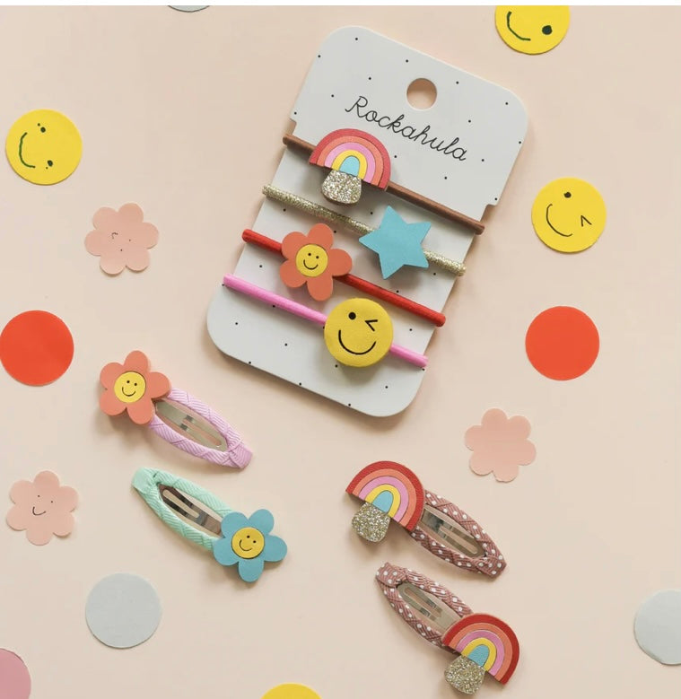 Somewhere over the rainbow... is this fun set of colourful ponies! With four assorted designs, featuring our rainbow toadstool, a bright star, our happy flower and a cheeky winking face. Wear them one at a time, or all at once!