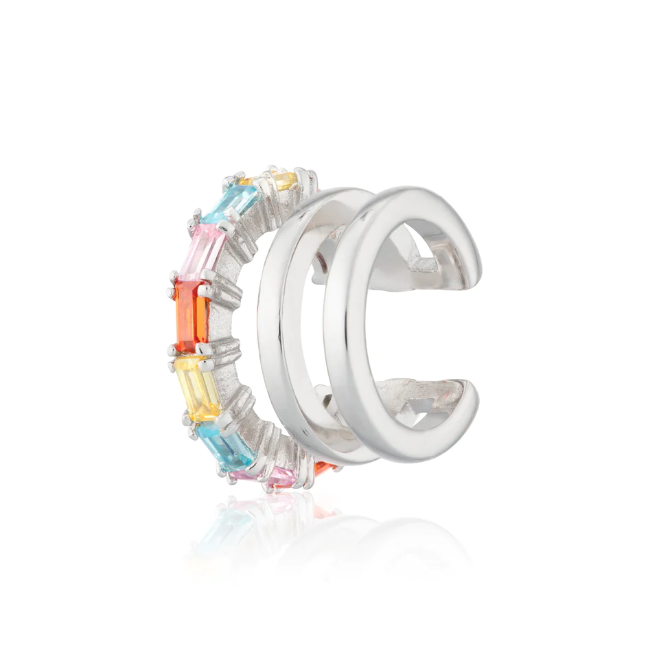 rafted from sterling silver or 18ct gold plated silver this ear wrap brings a sense of playfulness to your jewellery collection and is a design that is easy to weave into your everyday classics. Radiating with bright bursts of colour this rainbow ear cuff gives the illusion of a conch style earring with no piercing required and features three bands for a 3-in-1 earring design.
