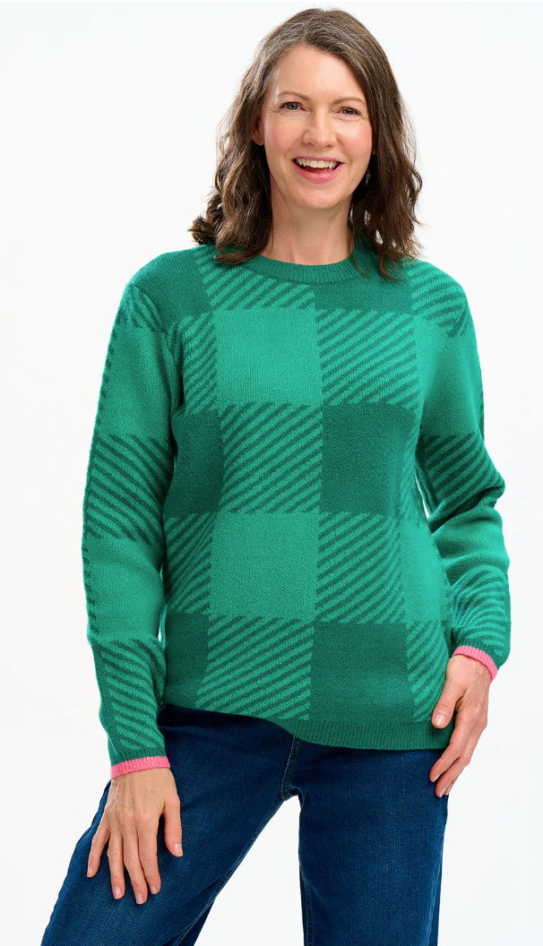 The Rayna has a relaxed, boxy fit with a shorter length and ribbed crew neck collar and cuffs in a double knit, textured yarn. The Giant Checkerboard design features a large scale check in shades of green, trimmed in a dark green edge with matching buttons and contrasting pink cuffs.