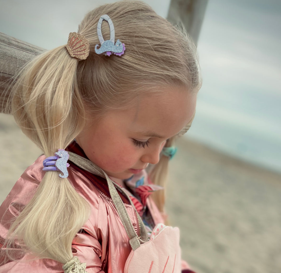 Elegant Sally seahorse adorns this fun pair of snap clips! In shimmering purple glitter, each seahorse has rosy cheeks and a cute frill detailing, and is secured to a lilac grosgrain ribbon wrapped clip.