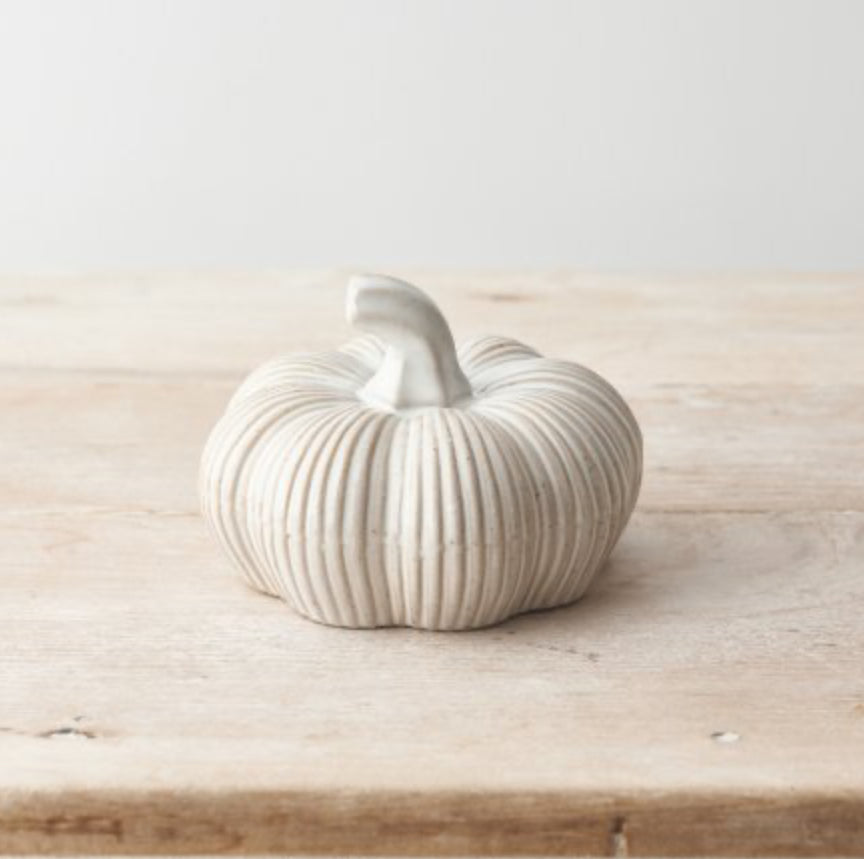A cute ceramic pumpkin decoration with ribbed design detail.