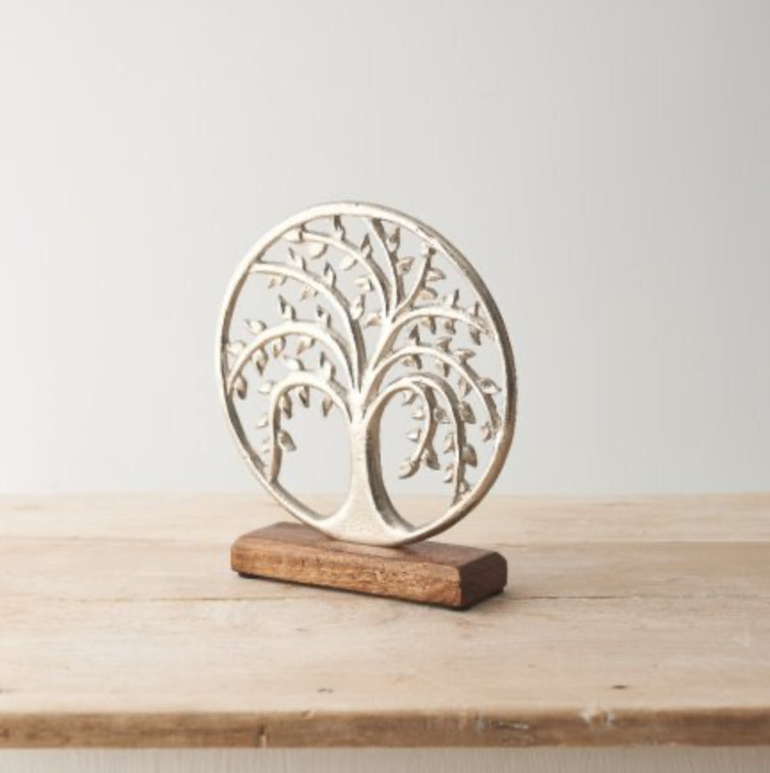 An attractive tree of life ornament. Beautifully crafted from hammered metal with delicate leaves. Presented on a base made from natural mango wood.