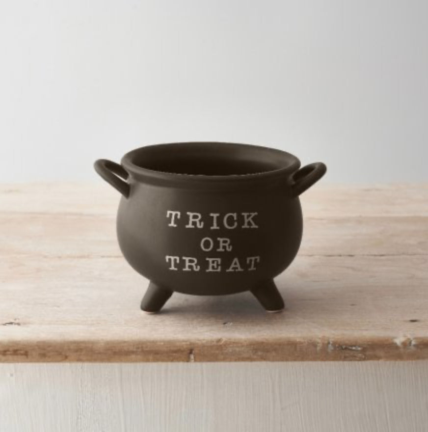 A unique cauldron shaped pot in black with trick or treat slogan.