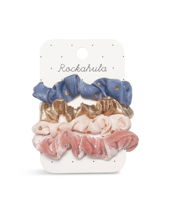 A pack of four enchanting and wearable scrunchies, each in a different beautiful fabric. Featuring our gorgeous satin print fabric with gold foil spots, a gold shimmer fabric and a super soft velvet fabric with silver sparkles.